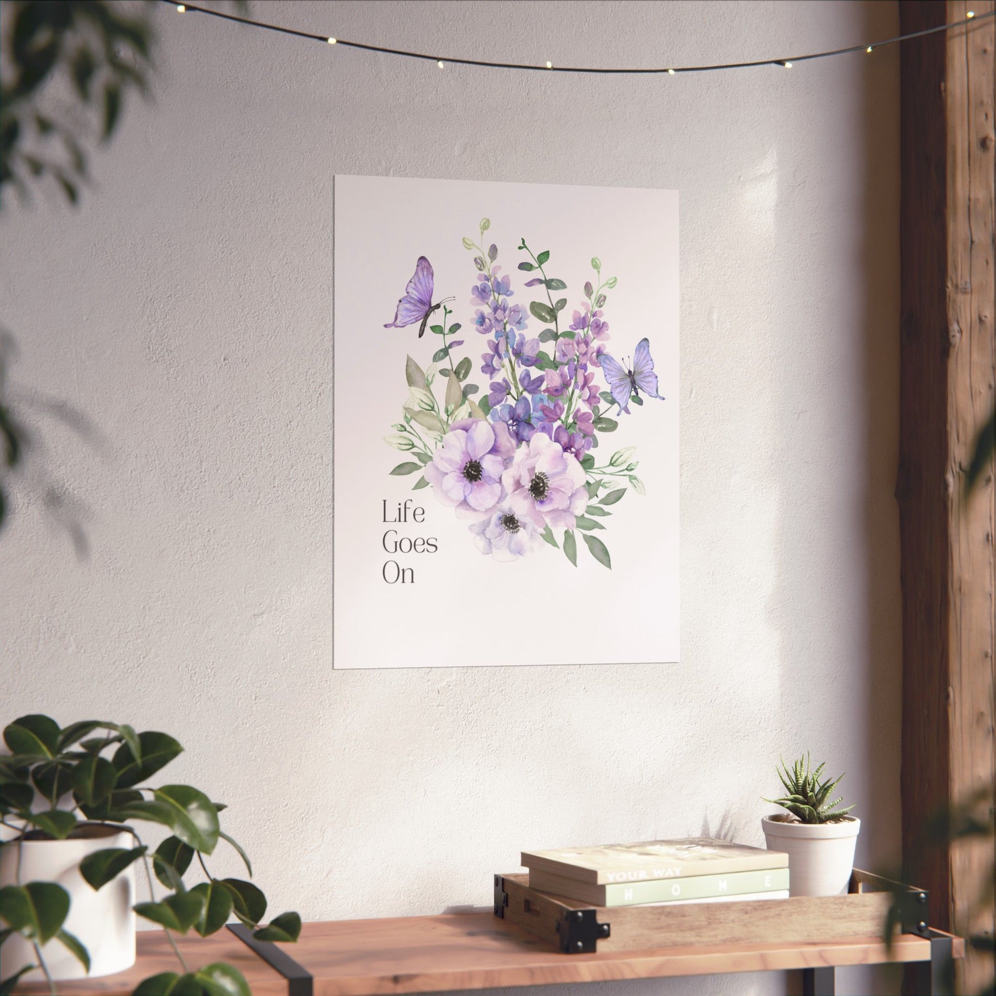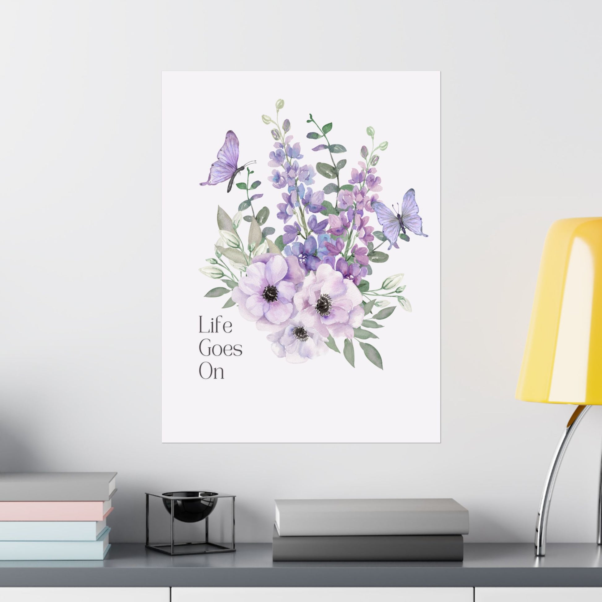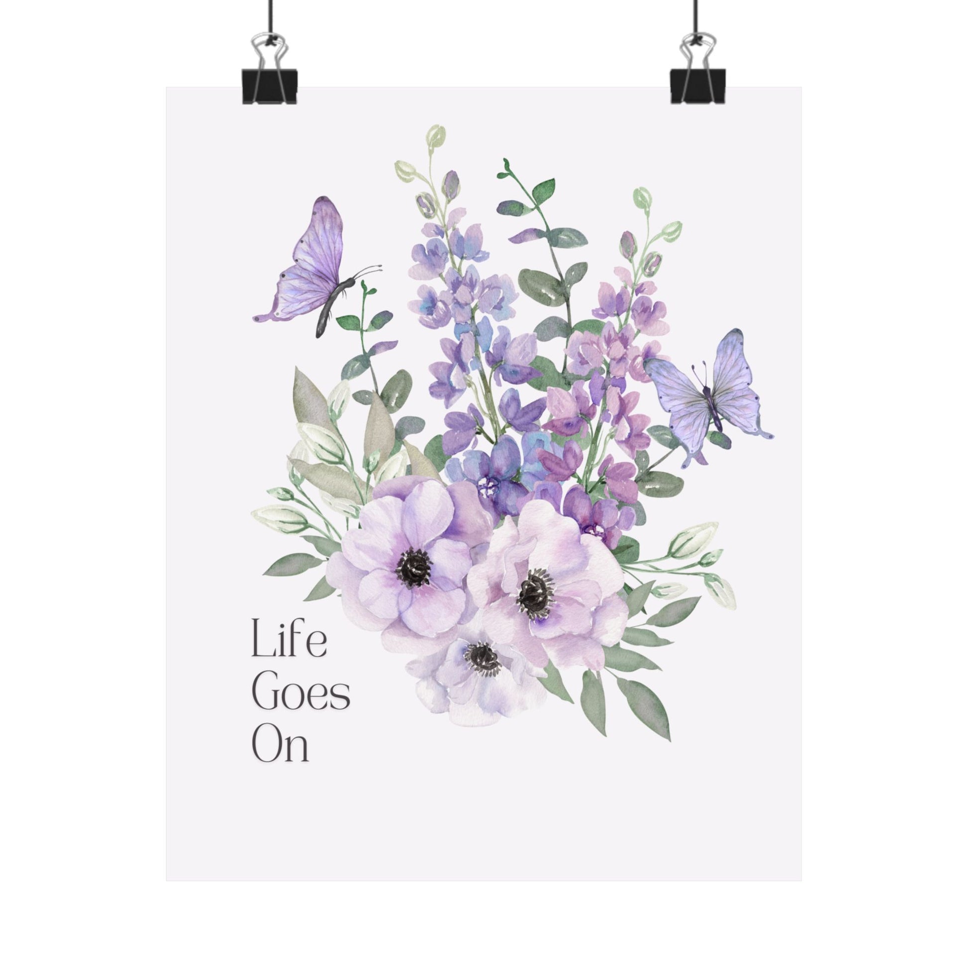 Soft, comforting botanical art printed on museum-grade matte paper. Lavender and mauve blooms mingle with delicate green foliage while two gentle butterflies flutter above. The subtle “Life Goes On” sentiment sits quietly to the side, lending the piece a calm, reflective mood, bedroom wall, or gentle reminder in a healing space. The matte finish soaks up light, keeping colors rich without glare, and the archival, giclée print preserves the watercolor’s soft gradients for years of indoor display.